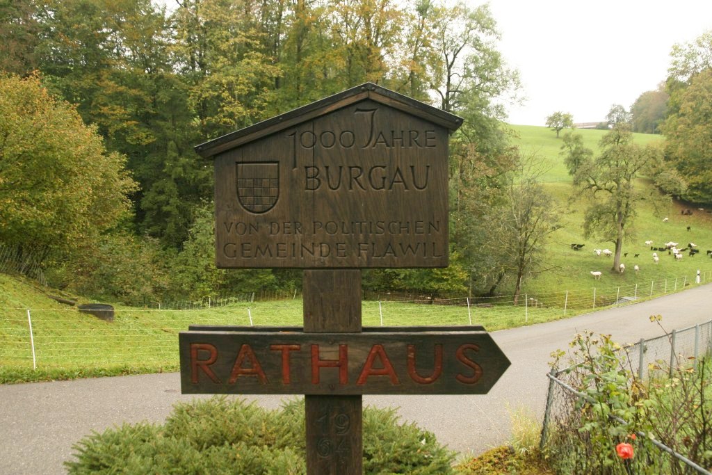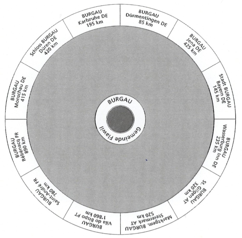 Seit 2021 gibt es auf dem Dorfplatz einen gepflasterten „Burgauer Steinkreis“, der die Entfernungen von Flawil zu den anderen 12 Burgaus in Europa anzeigt.