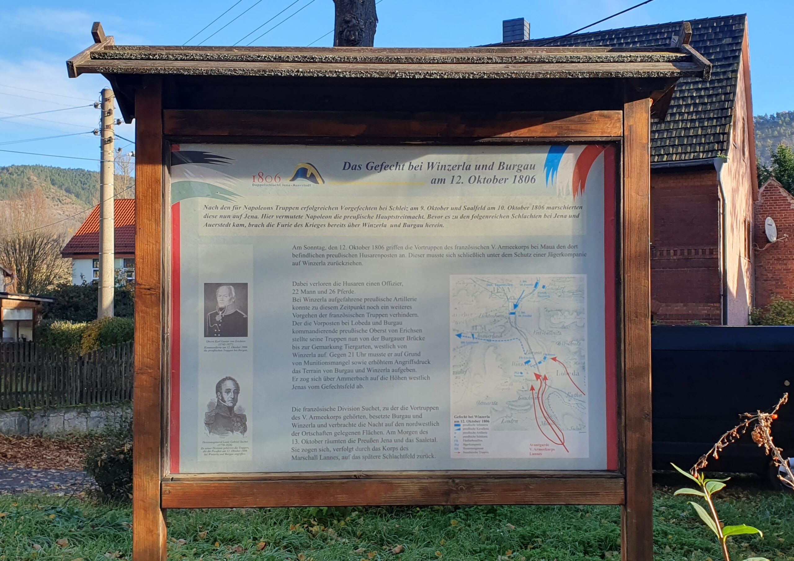 Auf der Ortsteilratssitzung am 09.09.2020 trug Renate Mäder die Projektidee vor, in Burgau einige bedeutende und markante Objekte mit Informationen zur Ortsgeschichte zu versehen. Diese Idee wurde vom Ortsteilrat aufgegriffen und zusammen mit dem Ortsverein Burgau e. V. ein Gemeinschaftsprojekt „Historischer Ortsrundgang Burgau“ ins Leben gerufen. Die Koordinierung des Projektes übernahm Dr. Werner Westhus. Es wurde im Frühjahr 2022 eine Organisationsgruppe gebildet, in der außer ihm folgende Personen mitwirkten: Renate Mäder als Vorsitzende des Ortsvereins Jena e. V., Dr. Dietmar Maetzig als Mitglied der Geschichtsgruppe innerhalb des ehemaligen Vereins „Die Burgauer e. V.“ und profunder Kenner der Ortsgeschichte, Annett und René Hachmeister, als Autorin bzw. Ideengeber der Fotodokumentation „Burgau „Alt und Neu““. Die nächsten Arbeitsschritte waren die Erstellung einer Projektskizze, die Auswahl der vorzustellenden geschichtlich und architektonisch interessantesten Bauwerke bzw. Ensembles Burgaus und die Sammlung von Material. Im Sommer 2023 erfolgte durch Dr. Werner Westhus das Einholen dreier Angebote zur Gestaltung und Herstellung der Informationstafeln, woraufhin von ihm ein Förderantrag bei JenaKultur gestellt werden konnte. Parallel wurde bei den Objekteigentümern um Zustimmung geworben und ihr Einverständnis eingeholt. Am 08. März 2024 erfolgte die Gewährung der beantragten Zuwendung im Rahmen der Kulturförderung der Stadt Jena. Daraufhin konnte dem Grafikbüro PIXARIO der Auftrag erteilt werden. Die Textentwürfe auf den Tafeln wurden von Dr. Dietmar Maetzig erstellt und von Dr. Werner Westhus ergänzt. Die Auswahl historischer Bilder lag vor allem in den Händen von Annett Hachmeister und Dr. Werner Westhus. Im April 2024 wurde ein Muster für die Tafeln von PIXARIO erstellt und abgestimmt, woraufhin im Juli 2024 die Entwürfe für die Tafeln vorgelegt und wiederum mit den Eigentümern abgestimmt worden sind. Parallel fand eine Abstimmung mit der unteren Denkmalschutzbehörde bei der Stadt Jena und dem Kommunalservice Jena statt. Am 20.11.2024 wurden die ersten sieben Informationstafeln angebracht, am 08.01.2025 die Bodenhülsen gesetzt und am 11.01.2025 die letzten Tafeln montiert. In kürzester Zeit erfolgen einige hundert Zugriffe auf die Webseite zum Ortsrundgang.