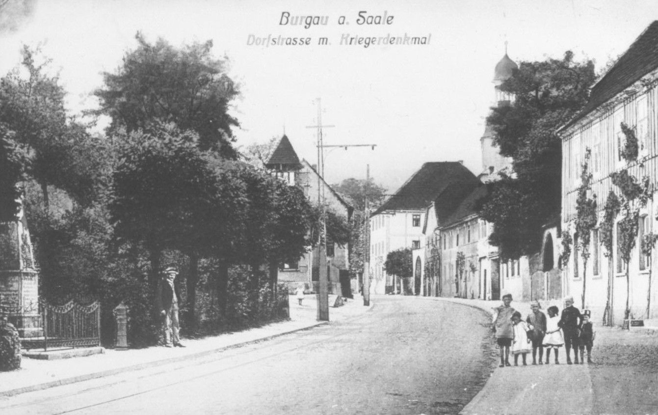 Postkarte von Burgau um 1910 mit Blick entlang der Geraer Straße in Richtung Westen und dem ehemaligen Pfarrhaus im Hintergrund in der Bildmitte
