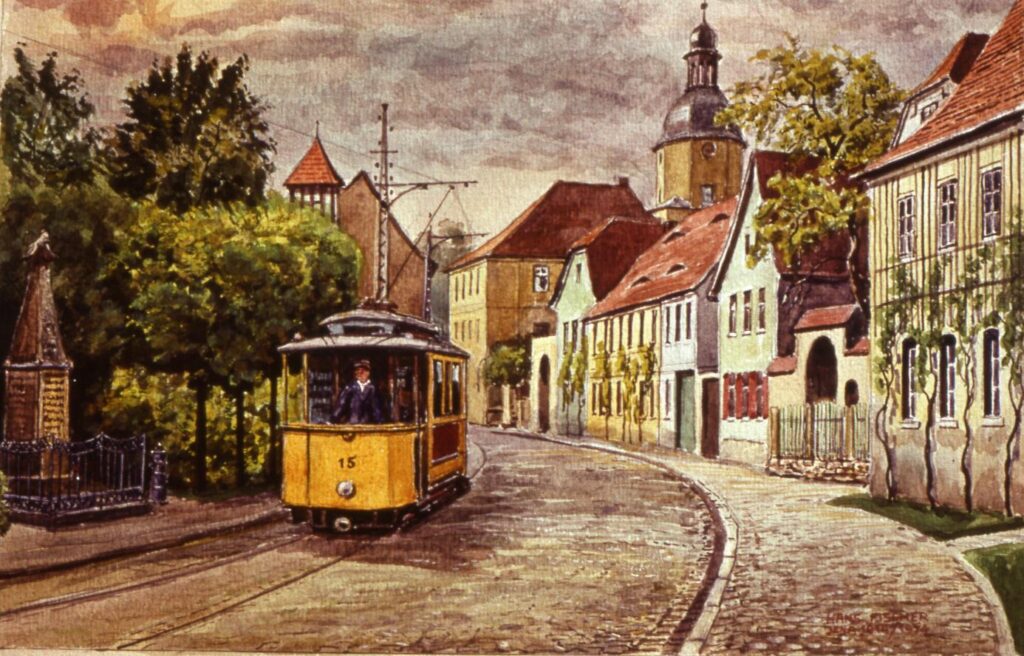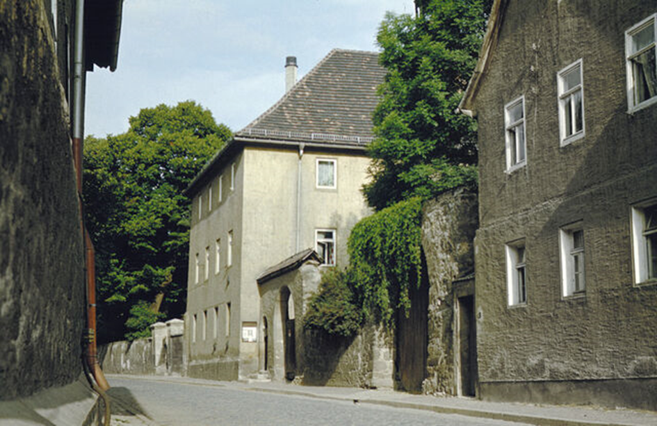 Geraer Straße mit dem ehemaligen Pfarrhaus (Bildmitte) (Foto H. Mey 1960er oder 1970er Jahre)
